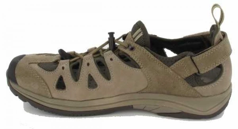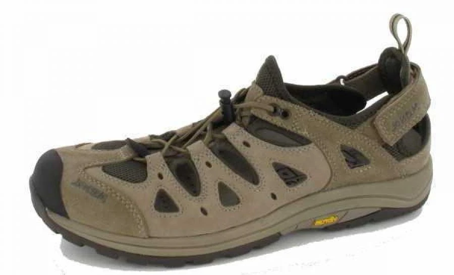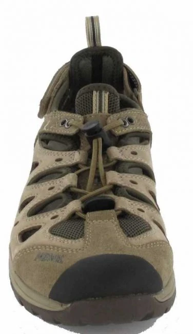 Funktionelle Sandale aus Nubuk-/Velourleder mit schnell trocknenden Klimafutter, einstellbares Klettband im Fersenbereich und flexible Schnellschnürung über den Vorfuß – dadurch optimaler Halt und Passform. Die halbgeschlossene Kappenform schützten die Zehen vor äußeren Einflüssen. Der eingebaute EVA-Dämpfungskeil garantiert Ihnen ein schonendes Gehen auf asphaltierten Wegen. Ideal als Freizeitschuh, Reiseschuh oder als Trekkingsandale